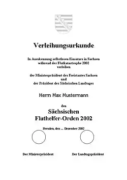 - ↑ Bekanntmachung des Präsidenten des Sächsischen Landtages und des Ministerpräsidenten über die Stiftung des Sächsischen Fluthelfer-Ordens 2002 vom 11. Oktober 2002, Nr. 3 Sächsisches Amtsblatt Nr. 45, Seite 1144