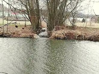 ![]() Mündung des Sägbachs (von hinten) in die Jagst (von rechts nach links). Im Hintergrund das Gewerbegebiet von Stimpfach. | ||