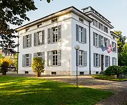 Das Haus wurde auf dem 1836 von Gottlieb Frey-Fischer (1797–1840) erworbenen Grundstück von einer Fläche von 45'000 Quadratmetern erbaut. Das Bauprojekt stammt vom Baumeister Hemmann aus Brugg, der als Experten Professor Karl Ferdinand von Ehrenberg aus Zürich beizog. Das Haus war 1838 bezugsbereit fertiggestellt. Im Jahr 1897 wurde das Giebelfeld ausgemalt. Diese Ausmalung, gefertigt durch die Schüler des Gewerbemuseums, wurde vor 1948 wieder entfernt, vermutlich bei der baulichen Erneuerung von 1940.