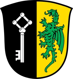 Blasonierung: „Gespalten von Schwarz und Gold; vorne ein senkrecht stehender, silberner Schlüssel mit dem Griff nach oben, hinten ein aufgerichteter grüner Drache.“[4] |