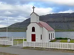 Auf dem geschichtsträchtigen Hof Vatnsfjörður, der sich am gleichnamigen Fjord zwischen Mjói- und Ísafjörður befindet, steht auf der Landspitze Vatnsfjarðarnes die 1911–1912 für 60 Personen erbaute Steinkirche Vatnsfjarðarkirkja.[11] Viele ihrer Kunstwerke sind heute im Isländischen Nationalmuseum ausgestellt. Nach der Reformation war die Vatnsfjarðarkirkja Pfarrkirche für einen der größten Bezirke Islands. Links vom Altar hängt ein großes Kreuz, das von dem 1888 verstorbenen Bildhauer Guðmundur Pálsson geschaffen wurde. Das Altargemälde mit der Jahreszahl 1860 wurde in Dänemark gestaltet und zeigt die Auferstehung Christi. Die seit 1990 denkmalgeschützte Kirche mit ihrem markanten Dachreiter weist eine Länge von 9,51 m und eine Breite von 5,69 m auf.[12]