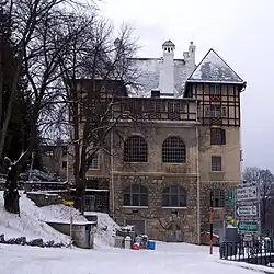 Mischung unterschiedlicher Baustile am Gebäudeteil bei der Hotelzufahrt -