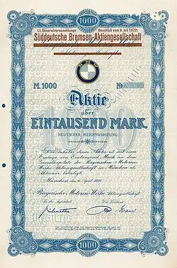 Als nach dem Friedensschluss in Deutschland keine Flugzeugmotoren gebaut werden durften, brauchte das Unternehmen eine neue Aufgabe. Zugleich suchte die in Berlin ansässige Knorr-Bremse AG einen Standort in Bayern, an dem sie vertragsgemäß Druckluftbremsen für die Wagen der Bayerischen Eisenbahnverwaltung fertigen konnte. Im Juni 1919 schloss sie mit der Bayerische Motoren-Werke AG einen Lizenzvertrag zum Bau der Kunze-Knorr-Bremse. Im Mai 1920 verkaufte dann der Alleineigentümer Camillo Castiglioni das Unternehmen an das Aktionärssyndikat der Knorr-Bremse AG, es wurde – dem neuen Produktionsschwerpunkt entsprechend – in Süddeutsche Bremsen-AG umbenannt. Mit Vertrag vom 20. Mai 1922 wurde die für die neuen Eigentümer wenig interessante Motorenabteilung zusammen mit dem abgelegten Firmennamen BMW verkauft. Beides ging an das bis dahin Bayerische Flugzeugwerke AG (BFW) genannte Unternehmen, das sich auf den Bau von Motoren für verschiedenste Zwecke verlegt hatte und dessen Fabrikanlagen nur wenige hundert Meter entfernt lagen.