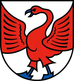Blasonierung: „In Silber ein schreitender roter Schwan mit erhobenen Flügeln und blauer Bewehrung.“[4]