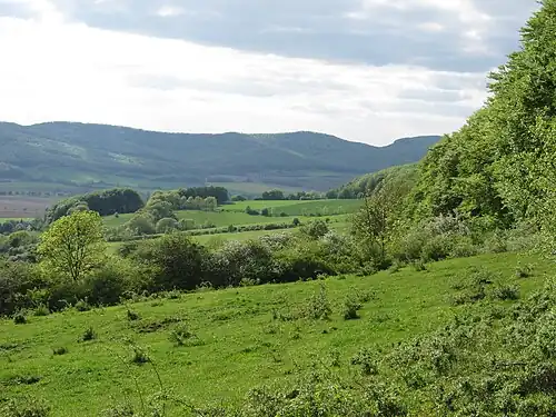 Blick entlang des Südhangs des Thüster Berges im NSG; im Hintergrund der Ith | ||