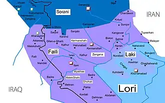 Südkurdisch wird in Iranisch-Kurdistan (Ilam, Kurdistan und Kermanschah) und im Süden von Irakisch-Kurdistan (Süd-Chanaqin, Kirind und Qorwaq) gesprochen.[4] Einzelne Enklaven der Feyli-, Kelhur- und Laks-Kurden kommen auch in der Türkei[5] und in den iranischen Provinzen Fars und Chorasan sowie im Elburs-Gebirge vor. Mit der Ausnahme einiger Kakai-Dörfer in Irakisch-Kurdistan sprechen alle Ahl-e Haqq-Kurden Dialekte des Südkurdischen.