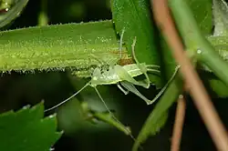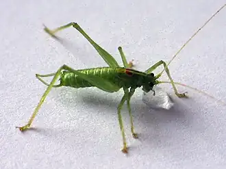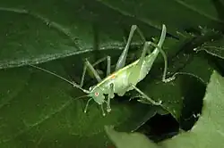 Die Südliche Eichenschrecke (Meconema meridionale) gehört zu der Überfamilie der Laubheuschrecken (Tettigonioidea) in der Unterordnung der Langfühlerschrecken (Ensifera).