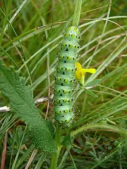Die Raupen erreichen eine Länge von 67 bis 88 Millimeter. Die anfangs zwei bis drei Millimeter langen Tiere sind zunächst schwarz und beborstet. Mit zunehmendem Wachstum treten orange Flecke um die Basis der Tuberkel, insbesondere ventro-lateral hervor. Diese dehnen sich im Laufe der Entwicklung weiter aus, verschmelzen miteinander und werden – anders als bei S. pavonia, wo dies selten schon vorher vorkommt – nach der dritten Häutung zunehmend grün.[2] In der Regel sind die ausgewachsenen Tiere pfefferminzgrün und tragen am Hinterleib eine gelbe Längslinie unterhalb der Stigmen. Jedes Segment ist am Rücken mit einem Halbring aus sechs stachelbewehrten Tuberkeln versehen, die manchmal basal einen schwarzen Ring tragen. Diese können bei manchen Tieren zu schwarzen Flecken verschmelzen. Die ausgewachsenen Raupen haben in ihrer Körperfarbe deutlich weniger Schwarzanteile als S. pavonia.[1]