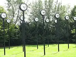 Eine Vielzahl von Kunstwerken fällt ohne Kenntnis kaum auf, z. B. die Große Giedion von Norbert Kricke, ein in der Wiese liegendes Band von Stahlrohren.[9] Weitere Kunstwerke sind, neben anderen, die Wasserachse von Christian Megert und Wasa Marjanov, die farbigen Stahlelemente von Erwin Reusch, eine Stele von Ulrich Rückriem und das prominent am Eingang Werstener Straße stehende Tor aus Basaltlava von Erwin Heerich.[1]