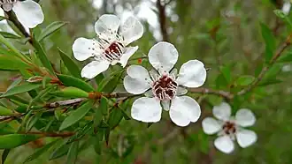 Die Pflanze enthält ätherische Öle; Manukaöl,[11] die antientzündlich und antibakteriell wirken.[12] An ihr gesammelter Manuka-Honig hat in kleineren Studien Wirkungen gegen Helicobacter pylori, gegen chronische Wunden und Hautinfektionen gezeigt und wird als Heilmittel vermarktet.[13] Besonders bakterizide Eigenschaften wurden gegen die Erreger Staphylococcus aureus und Escherichia coli festgestellt.[14]