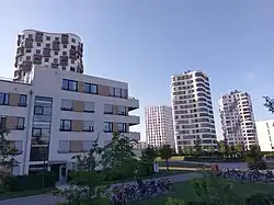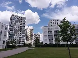 Östlich der Bahnstrecke wurden in einer parkartigen Anlage fünf unterschiedlich gestaltete Hochhäuser mit jeweils 16 Stockwerken gruppiert; sie sind einzeln benannt: Sternenhimmel, Alpenglühen, Isar Tower Süd, Isar Tower Nord und Pandion IsarBelle.[2] Nördlich davon zwischen Koppstraße und Colmarer Straße entsteht (Stand 2018) ein kleines Gewerbegebiet.