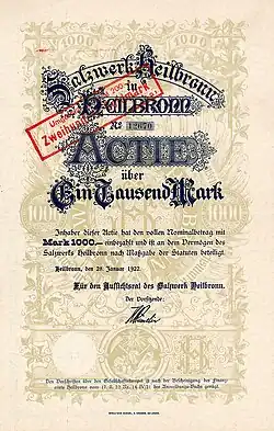 Die Salzwerk Heilbronn AG wurde 1883 von einem Konsortium aus württembergischen und Frankfurter Banken sowie der Stadt Heilbronn gegründet und betrieb zunächst die 1820 gegründete Saline Friedrichshall in Jagstfeld. 1885 begann auch die Steinsalzförderung in Heilbronn. Nachdem der Schacht der Saline in Jagstfeld wegen Wassereinbruch aufgegeben werden musste, wurde 1899 im benachbarten Kochendorf unter der Leitung von August Bohnert der neue Schacht „König Wilhelm II“ angelegt. In diesem Schacht fand von 1913 bis 1915 auch die Produktion von Explosivstoffen unter Lizenz der Berliner Miedziankit GmbH statt.[2] Als Tochtergesellschaft wurde am 11. Oktober 1922 die Glashütte Heilbronn gegründet, die bei der Salzproduktion abfallende Stoffe zur Glasherstellung verwenden konnte. Sie nahm am 14. August 1923 die Produktion auf und stellte auf dem Salzwerkgelände vornehmlich Weinflaschen her.[3]