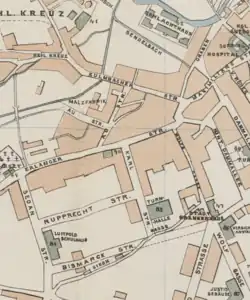 Um 1900 wurde der Bereich südlich der Erlanger Straße baulich erschlossen. Bereits aus dem Jahr 1889 stammt die Rathenaustraße (vor 1947: Kasernstraße bzw. Straße des 7. Infanterieregiments)[12] als nördliche Begrenzung des Kasernenviertels. Am Nordrand der Rathenaustraße wurden im Zuge des Kasernenbaus im Baustil der Kasernen Häuser errichtet, in denen Offiziere mit ihren Familien in gehobenem Wohnstil lebten. 1893 wurde die Karlstraße (seit 1947: Albert-Preu-Straße),[13] 1897 wurden die Sedanstraße (seit 1947: Oswald-Merz-Straße)[14] und der östliche Abschnitt der Rupprechtstraße[15] angelegt. Die Bismarckstraße entstand, zunächst zwischen der Karl- und der Sedanstraße, im Jahr 1901.[16]
