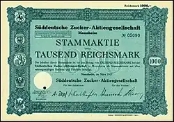 Aktie über 1000 RM der Süddeutschen Zucker-AG vom März 1927