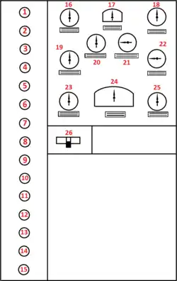 Die Anordnung der Bedieneinrichtungen und Anzeigegeräte ist aus folgender Skizze ersichtlich. 1: Anlassen des Dieselmotors, 2: gesamte Leitung, 3: Kraftstoffpumpe, 4: Scheinwerfer vorn, dunkel, 5: Scheinwerfer vorn hell, 6: Scheinwerfer hinten, dunkel, 7: Scheinwerfer hinten, hell, 8: Fernscheinwerfer, dunkel, 9: Fernscheinwerfer, hell, 10: Führerstandsbeleuchtung, 11: Gerätebeleuchtung, 12: Beleuchtung hintere Maschinenabdeckung, 13: Beleuchtung der Geräte, 14: Beleuchtung des Maschinenraumes, 15: Elektromotor, Ventilator, Heizung der Kabine, 16: Thermometer Öltemperatur, 17: Strommesser Batterie, 18: Manometer Hauptluftleitung, 19: Öltemperatur nach Kühlung, 20: Öldruckmanometer, 21: Kraftstoffdruckmanometer, 22: Manometer Druck im Brennstoffbehälter, 23: Kühlwassertemperatur, 24: Luftdruck, 25: Zeit, 26: Umschalter elektrische Fahrmotoren (Reihe, parallel)