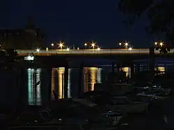 Rheinbrücke bei Nacht mit einem „Seehas“.