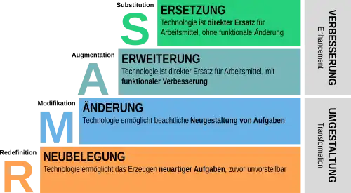 Das SAMR-Modell ist ein vierstufiger Ansatz zur Auswahl, Nutzung und Bewertung von Technologie in der Bildung. Dieses Modell zeigt in vier Stufen, in welcher Weise und in welchem Ausmaß digitale Medien im Unterricht den Lehr- und Lernprozess bereichern (Verbesserung: Stufe S und A) bzw. verändern (Umgestaltung: Stufe M und R).[3]