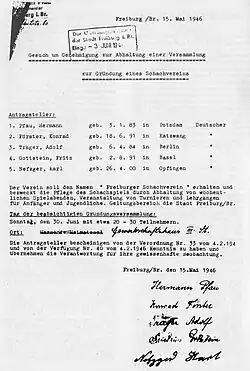 1946 nach Ende des Zweiten Weltkrieges versammelten sich einige frühere Mitglieder der alten Schachklubs im Haus von Rechtsanwalt Erwin Cuntz. Für den Antrag auf Neugründung (eine Vereinsfortführung unter altem Namen war verboten) brauchte es drei unbelastete Personen. Um eine Versammlung zur Gründung eines Schachvereins abhalten zu können, musste ein entsprechendes Gesuch bei der Stadt Freiburg eingereicht werden. Hermann Pfau der Ex-Präsident des 1933 aufgelösten Arbeiterschachklubs wurde Präsident des neuen Vereins. In der Satzung wurde der Verein als Neugründung des Arbeiterschachklubs apostrophiert und erhielt den Namen Freiburger Schachverein.