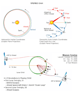 Während mehrerer Erdumläufe entfernen sich die Raumsonden voneinander. Am 15. Dezember 2006 führten STEREO A (Ahead) und B (Behind) ein Swing-by am Mond aus, wobei STEREO A den Mond in einer Entfernung von 7.322 km passierte und STEREO B in 11.750 km. STEREO A überschritt dadurch die Fluchtgeschwindigkeit des Erde-Mond-Systems und fliegt der Erde in ihrer Umlaufbahn um die Sonne voraus. STEREO A trat dabei in eine Sonnenumlaufbahn ein, die etwas innerhalb der Erdumlaufbahn liegt und deren Umlaufzeit 346 Tage beträgt. STEREO A umkreist dadurch die Sonne schneller als die Erde und läuft jedes Jahr gegenüber der Erde um 22° weiter auf ihrer Umlaufbahn nach vorne.