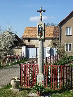 ![]() Die Saalauer Mühle mit einem für die katholische Region typischen Wegkreuz im Vordergrund
