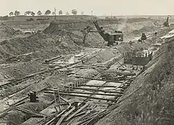 Am 11. Juli 1933 begannen bei Burghausen die Arbeiten am Kanal. Bis zu 2000 Arbeitskräfte, die zuerst im Rahmen einer Arbeitsbeschaffungsmaßnahme vorwiegend unter Arbeitslosen rekrutiert wurden, waren an der Baustelle, die 1934 eine der größten im Deutschen Reich war, eingesetzt. Mit einer Tiefe von 3,5 m und einer Wasserspiegelbreite von 32 m bis 37 m war der Kanal für zweischiffigen Betrieb mit den damals modernsten 1000-t-Kanalschiffen ausgelegt. Bis 1936 gingen die Arbeiten zügig voran, der aufrüstungsbedingte Arbeitskräftemangel konnte durch den Einsatz schwerer Baumaschinen wie Eimerkettenbagger und Kratzbänder kompensiert werden. In den folgenden Jahren verringerte sich jedoch die Intensität der Arbeiten zu Gunsten einer beschleunigten Fertigstellung des für den Transport wichtiger Rüstungsgüter benötigten Mittellandkanals immer weiter. Die Geländegegebenheiten im geplanten Verlauf des Kanals bis zur Saale erforderten teilweise Aufschüttungen von bis zu 16 Meter über Geländeniveau; dieses aufgeschüttete Teilstück bezeichnet man als Dammstrecke.[4]