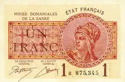 Wirtschaftlich wurde das Saargebiet in das französische Zoll- und Währungsgebiet einbezogen. Seit dem 1. Juni 1923 war der französische Franc alleiniges Zahlungsmittel. Nach Ablauf einer fünfjährigen Übergangsfrist wurde am 10. Januar 1925 das Saargebiet in das französische Zollgebiet integriert. Weil das Deutsche Reich nicht nur die Saarkohle verlor, sondern nach der Volksabstimmung in Oberschlesien 1921 außerdem Teile des oberschlesischen Kohlebeckens an Polen abtreten musste, verlor es nahezu die Hälfte seiner Kohlevorkommen. Frankreich vergrößerte dagegen seine Ressourcen bei der damals wichtigsten Energiequelle. Durch die Enteignung des schwerindustriellen Besitzes in Lothringen und weil Luxemburg nicht mehr zum Deutschen Zollverein gehörte, konnte Frankreich das Deutsche Reich in seiner Rolle als größter Eisenproduzent Europas ablösen.[25] Im Saargebiet gab die französische Grubenverwaltung außerdem mit dem „Grubengeld“ Geldscheine zu 50 Centimes, ein Franc sowie zwei Francs als Notgeld aus, da Buntmetalle Mangelware waren (nicht zu verwechseln mit dem nach dem Zweiten Weltkrieg eingeführten Saar-Franken).