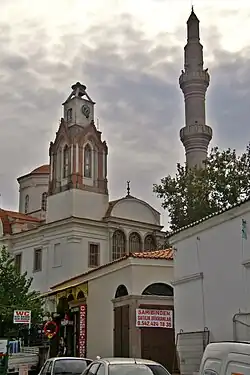 Seit der Glockenturm bei einem Erdbeben im Jahre 1944 oben zerstört und in einen Uhrturm umgewandelt wurde, wird die Moschee „Moschee mit Uhr“ (Saatli Camii) genannt. Im September 2003 stürzte bei einem Sturm das Minarett auf die Kirche und beschädigte die mit Ziegelsteinen bedachte Kuppel.