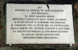 Am 29. August 1512 – nach langem Kampf – zogen die Spanier in die Stadt Prato ein. Die Spanier zeigten kein Mitleid mit den Menschen (auch nicht mit Frauen, Kindern und älteren Menschen), die sich in die Kirchen geflüchtet hatten. Die Plünderung von Prato dauerte 21 Tage, geprägt von Terror und blutigen Kämpfen. Bis zu 6.000 Bürger von Prato wurden durch das Heer de Cardonas getötet.[3]