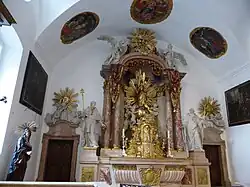 Über dem Sacellum befindet sich ein achtseitiger blechverkleideter Dachreiter mit Schallfenstern, Spitzdach, Knauf und Kreuz.