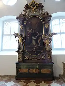 Der Hochaltar aus Adneter und Untersberger Marmor ist ein Werk der Brüder Wolfgang und Johann Baptist Hagenauer aus den Jahren 1766 bis 1768. Er wurde von P. Placidus Scharl, Seelsorger und Dramaturg am Universitätstheater, initiiert. Er stellt die Gottesmutter Maria mit einem Strahlenkranz auf der Weltkugel, um die sich eine Schlange windet, dar. Ein prächtiger Baldachin rahmt die Gottesmutter ein. Die barocke Marienfigur ist nicht die originale, die vermutlich während der Napoleonischen Kriege abhandengekommen ist, sondern wurde im 20. Jahrhundert aus der Pfarrkirche Siezenheim hierher gebracht. Auf der linken Seite des Altars steht eine gefasste Holzskulptur des Karl Borromäus, Cousin der Salzburger Erzbischöfe Wolf Dietrich von Raitenau und Markus Sittikus, und auf der rechten die des Benedikt von Nursia, beide Patrone der Salzburger Universität. Unterhalb der beiden Heiligen zeigen zwei vergoldete Bleireliefs bedeutende Ereignisse aus dem Leben der Heiligen, die Pflege von Pestkranken bei Karl Borromäus und den Empfang des Ostgotenkönigs Totila bei Benedikt von Nursia. Dieser Altar wurde von Erzbischof Sigismund von Schrattenbach gestiftet und eingeweiht; sein Herz ist vor der Altarmensa unter einer ovalen Steinplatte beigesetzt.