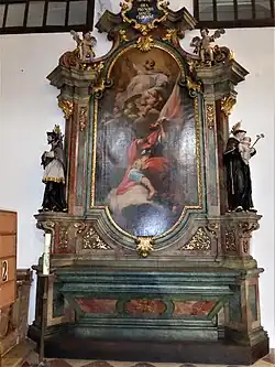 Der linke Seitenaltar (um 1750) zeigt den Kirchenlehrer Thomas von Aquin; dies ist ein Hinweis auf die theologische Ausbildung an der Universität Salzburg. Das Altarbild zeigt eine Szene aus der Heiligenlegende: Nachdem Thomas mit einem brennenden Holzscheit eine Prostituierte vertrieben hatte, die ihn verführen sollte, erscheinen ihm im Traum zwei Engel. Diese legen einen Strick mit fünfzehn Knoten um ihn. Die Mitglieder der seit 1653 an der Universität Salzburg etablierten Bruderschaft des hl. Thomas von Aquin trugen einen ebensolchen Strick als Gürtel; die fünfzehn Knoten sollten die Studenten daran erinnern, täglich fünfzehn „Ave Maria“ zur Bewahrung ihrer Keuschheit zu beten.