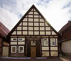 Eines der ältesten Fachwerkhäuser Sachsenhagens: Mittelstraße 10 von 1621 - Im Ortskern findet man noch mehrere Fachwerk-Dielenhäuser des 17. bis 19. Jahrhunderts. Die ältesten stehen an der Mittelstraße und wurden direkt nach dem verheerenden Brand von 1619 erbaut. Das Haus Nr. 6, das über eine Auslucht verfügt, ist zwar mit den römischen Ziffern M D X X X I (=1531) versehen, doch soll der Zimmermann hier die Jahreszahl falsch eingeschlagen haben.[13] Tatsächlich stammt es wohl aber erst von 1621. Aus demselben Jahr stammt Mittelstraße Nr. 10, während das Haus Nr. 12, das ebenfalls über eine Auslucht verfügt, am Tor 1622 bezeichnet ist. Durchweg jüngeren Datums sind die Fachwerkbauten an der Oberen Straße, die zumeist in der ersten Hälfte des 19. Jahrhunderts entstanden, so Nr. 8, 14 und 22a, die allesamt 1831 erbaut wurden.