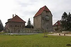 Die ehemalige Wasserburg wurde zwischen 1248 und 1253 durch Herzog Albrecht I. von Sachsen-Lauenburg errichtet und 1595–97 zur Residenz ausgebaut. Der Wohnturm stammt im Kern wohl noch aus dem 14. Jahrhundert. Er wurde ab 1565 durch Jacob Kölling erneuert und mit einem Treppenturm versehen. Das gegenüberliegende Amtshaus wurde 1595–97 in seiner jetzigen Form als Wohnhaus errichtet, enthält aber vermutlich einen älteren Kern. Es ist ein niedriger Massivbau mit Walmdach, der an der Giebelseite einen Erker aufweist. - Rathaus Sachsenhagen