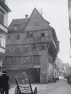 3. Vorn: das neue Sachsenheim-Haus (bis zum Erker), an der Hausecke: Rest der Stadtmauer (mit Laterne), daneben der durch beide Häuser verlaufende Tordurchgang. Hinten: altes Sachsenheim-Haus (mit auskragendem Obergeschoss).