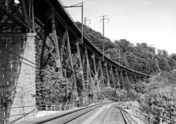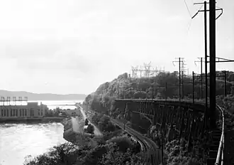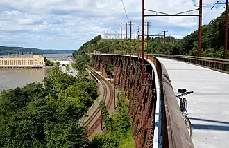 Rechts die stillgelegte Trestle-Brücke, davor die untere Gleisebene und links das Kraftwerk des Safe Harbor Dam (Blick nach Nordwest, HAER von 1999)