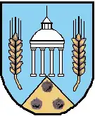 Blasonierung: „In Blau über einer erniedrigten goldenen Spitze, darin drei (1:2) blaue Bügelkronen, zwischen zwei seitlich leicht gebogenen goldenen Ähren ein silberner Brunnentempel.“