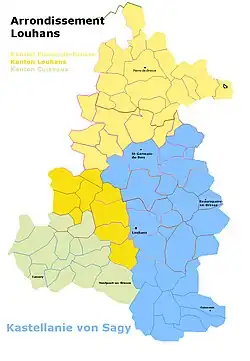 - ↑ Die Kastellanei von Sagy umfasste in etwa die folgenden Gemeindegebiete: Sagy, Cuiseaux, der Ostteil der Stadt Louhans, Beaurepaire-en-Bresse, Bruailles, Champagnat, Condal, Dommartin-lès-Cuiseaux, Le Fay, Flacey-en-Bresse, Frontenaud, Joudes, Montagny-près-Louhans, Ratte, Saillenard, Sainte-Croix-en-Bresse, Saint-Usuge, teilweise Saint-Germain-du-Bois, Saint-Martin-du-Mont, Savigny-en-Revermont, Varennes-Saint-Sauveur, Vincelles, la grande und la petite Chaux in Simard, der Weiler Clémencey, ohne das Schloss in Frangy-en-Bresse und Le Miroir.