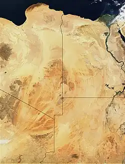Die Wüstenlandschaften der Sahara liegen auf einem Tafelland, das im Durchschnitt 200 bis 500 Meter über dem Meeresspiegel liegt.[9] Das kristalline Grundgestein des Tafellandes bildet im Westen der präkambrische Westafrika-Kraton. Das Tafelland wird überragt von den Gebirgsketten des Ahaggar im Westen, des Aïr im Südwesten, des Tibestigebirges im Zentrum, Gabal Uwainat im Nordosten und des Ennedi im Südosten. Höchste Erhebung der Sahara ist der Emi Koussi im Tibesti mit 3415 m über dem Meeresspiegel. Eingebettet in Tafel- und Gebirgslandschaften liegen ausgedehnte Senkungsgebiete, wie die Bodélé-Depression oder die Qattara-Senke, flachgeschliffene Felsplateaus, wie das Erdi-Ma oder das Gilf el-Kebir, und tiefeingeschnittene Täler, wie das der Dilia de Lagané oder das Kaouar-Tal.