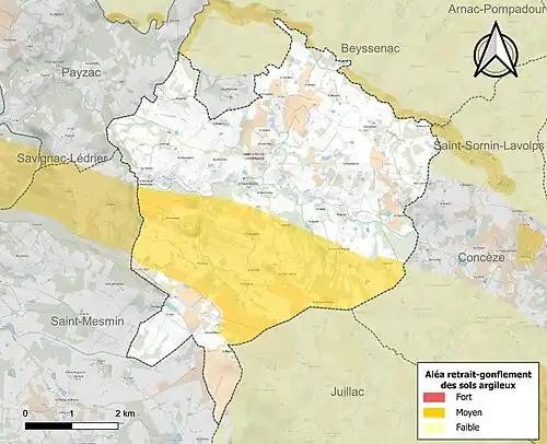 Wie die Risikokarte zeigt, ist Payzac von der Gefahr durch Bodensetzungen nur marginal betroffen – von mittlerer Intensität im Bereich des Donzenac-Schiefers im Süden.