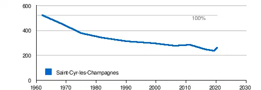 Die Bevölkerungszahlen von Saint-Cyr-les-Champagnes waren von 1962 bis 2019 generell rückläufig, mit einer leicht positiven Schwankung um 20111. Sie zeigen jetzt einen Anstieg.