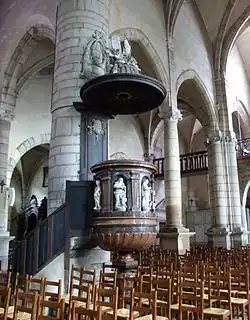Im inneren der Kirche wurde die Kanzel aus einem einzelnen roten Gesteinsbrocken (Kalkstein des Bajocium) aus den Brüchen bei Sampans gehauen und mit dem schwarzen Kalkstein (Sinemurium) Noir de Miéry ergänzt. Ebenso entstanden aus ihm die vier Statuen der Evangelisten am Kanzel-Korpus. Die Statuen von Johannes dem Täufer (Saint Jean Baptiste) und von Simon Petrus (St. Pierre) wurden vermutlich von Pfarrer Pierre Longuet 1604 gestiftet.