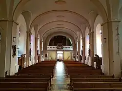 Durch die Fenster mit Glasmalereien wirkt der weitgehend weiß gehaltene Innenraum dunkel bzw. herrscht eine diffuse Lichtwirkung vor. Der Innenraum selbst ist von barocken Farb- und Wandelementen weitgehend befreit. Durch das farbliche (mittelbraun) hervorheben von Rippen des Tonnengewölbes und Säulenteilen wird der Innenraum strukturiert und erhält einen ansprechenden architektonischen Effekt.