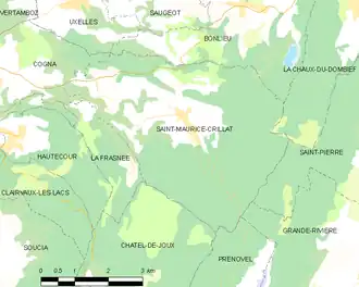 Nachbargemeinden von Saint-Maurice-Crillat sind Bonlieu im Norden, La Chaux-du-Dombief und Saint-Pierre im Osten, Grande-Rivière Château, Nanchez und Châtel-de-Joux im Süden sowie La Frasnée und Cogna im Westen.
