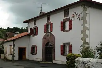 - Bauernhof Lakoa. Die Datierung der Errichtung des Bauernhauses wird aufgrund seiner Verwendung von Holzfachwerk vermutlich auf die zweite Hälfte des 17. Jahrhunderts zurückgehen. Die Fassade wurde am Ende des 18. Jahrhunderts ausgebessert, wie die Jahreszahl „1799“ auf dem Sturz des linken Fensters im Erdgeschoss anzeigt. In der zweiten Hälfte des 19. Jahrhunderts wurde ein Anbau an der linken Seite hinzugefügt, in der zweiten Hälfte des 20. Jahrhunderts wurde der Geflügel- und Schweinestall abgerissen. Das Satteldach des Hauses ist mit Hohlziegeln gedeckt. Die linke Trennwand ist eingestürzt, so dass die Ständer des Fachwerks sichtbar sind. Der zentrale eskaratz führt rechts zur Küche und links zu den früheren Schlafzimmern. In der Küche ist ein Kamin mit dreieckigen Konsolen und ein altes Spülbecken aus Stein bewahrt worden. Der Stall belegt den gesamten rückwärtigen Teil des Bauernhofs. Die nordöstliche Fassade des Hauses ist mit Holzlatten verschönert, die mit Briketts und Lehm gefüllt sind. Die Holzlatten sind mit vier dreieckigen Löchern versehen. Die Fenster des Erdgeschosses sind aus Sandstein, die des Dachgeschosses aus Holz. Der Sturz des linken Fensters zeigt neben der Jahreszahl eine Monstranz, vier Rosetten und zwei Baskische Kreuze, Lauburu genannt. Die rechte Tür der Fassade hat ein Fenster ersetzt. Das Haus war bei der Erfassung als nationales Kulturgut im Jahr 2000 in einem schlechten Zustand.[27]
