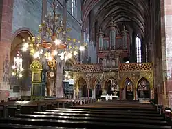 • Der aus dem 14. Jahrhundert stammende gotische Hauptbau mit seinen zahlreichen Kapellen und dem aufwändigen Kreuzrippengewölbe[9] ist mit Fresken geschmückt, die im Lauf weiterer Jahrhunderte entstanden.[10] Grabplatten und -Denkmäler, der Taufstein,[11] das Mittelbild des Hauptaltars[12] sowie der im Elsass inzwischen einzigartige Lettner sind ebenfalls erhalten.[13]