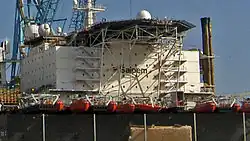 Auch Rumpf, Deck und die Struktur des Decks mussten umgebaut werden, um den J-Lay-Turm, ebenfalls eine Entwicklung von Gusto, und seine Zusatzausrüstung aufzunehmen. Der J-Lay-Turm der S 7000, der von Huisman-Itrec in Rotterdam konstruiert wurde, ist mit einer Höhe von 135 m der größte der Welt.[7] Mit ihm ist das Verlegen von Pipelines mit einem Durchmesser von etwa 0,1 m bis 0,8 m (4 bis 32 Zoll) und einer Zugspannung von 5,25 Meganewton (MN) mit drei Spannrollen und bis 20 MN mit Reibungsklammern möglich. Im Turm können auch Spezialbauteile für Pipelines bis zu einem Durchmesser von 1200 mm gehandhabt werden.