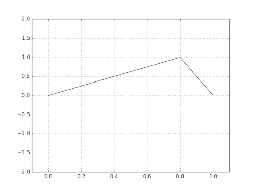Animation der Schwingung der gezupften Saite mit b=0,8; c=1; h0= 1; L=1. Diese Animation wurde mit 200 Gliedern der Fourier-Reihe berechnet.