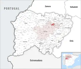 Die im Nordteil der Iberischen Hochebene (meseta) in einer Höhe von gut 800 m gelegene Stadt Salamanca liegt hauptsächlich auf dem Nordufer des Río Tormes etwa 215 km nordwestlich von Madrid. Das Klima ist gemäßigt bis warm; Regen (durchschnittlich 400 mm/Jahr) fällt überwiegend im Winterhalbjahr.[4]