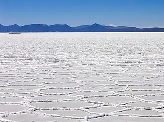 Der Salar de Uyuni (auch Salar de Tunupa) in Bolivien ist mit mehr als 10.000 Quadratkilometern die größte Salzpfanne der Erde.[4] Die Salzkruste wurde vor über 10.000 Jahren durch das Austrocknen des Paläosees Tauca gebildet.[3][5]