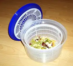Die Salatschleuder ist ein Küchengerät, mit dem nasse Salatblätter nach dem Zentrifugen-Prinzip von überschüssigem Wasser befreit werden.